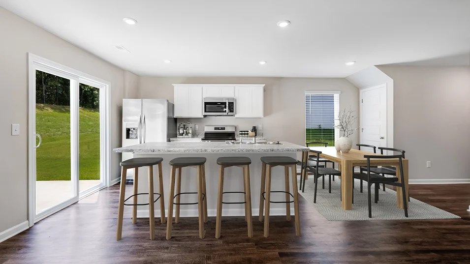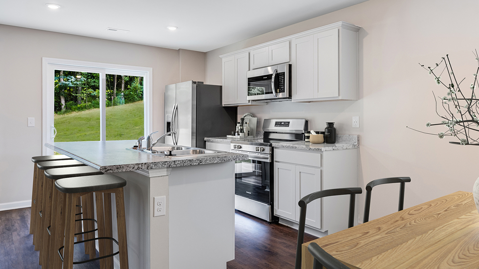 An open and modern kitchen offers easy access to everything an aspiring home chef needs, including sleek cabinetry, durable countertops and a spacious center island.