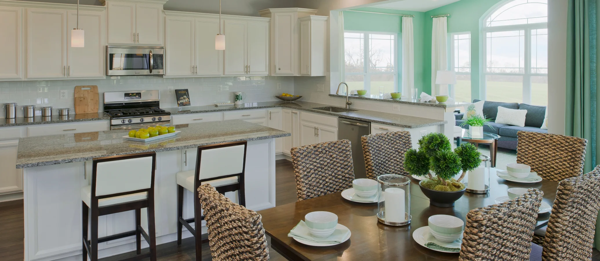 This two-story home is the largest plan in this collection and features a formal dining room followed by an open living space in the family room, breakfast area and kitchen. Upstairs are four bedrooms, including the luxe owner’s suite, and a loft for an extra common area.
